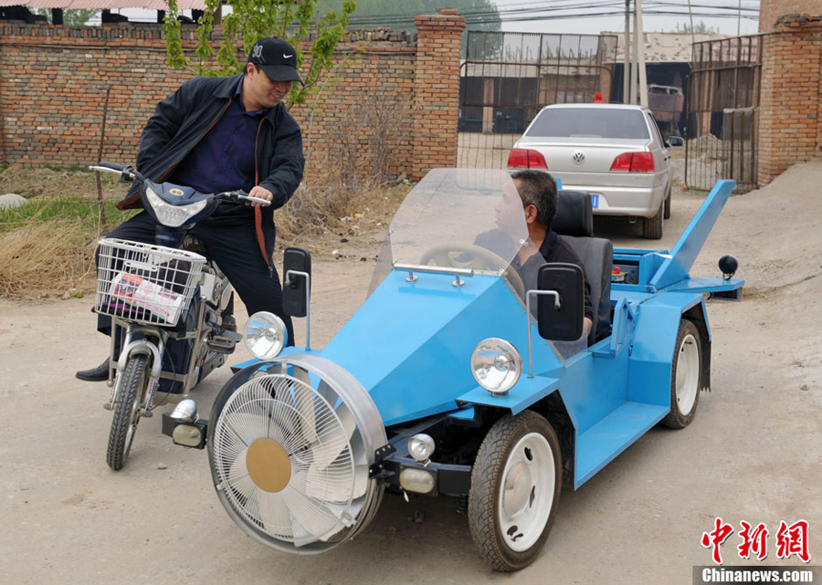 Tang Zhenping fährt sein elektrisches Fahrzeug im Dorf Banjiehe im Beijinger Bezirk Tongzhou. Das Fahrzeug kann eine Geschwindigkeit von bis zu 70 Kilometern pro Stunde erreichen.