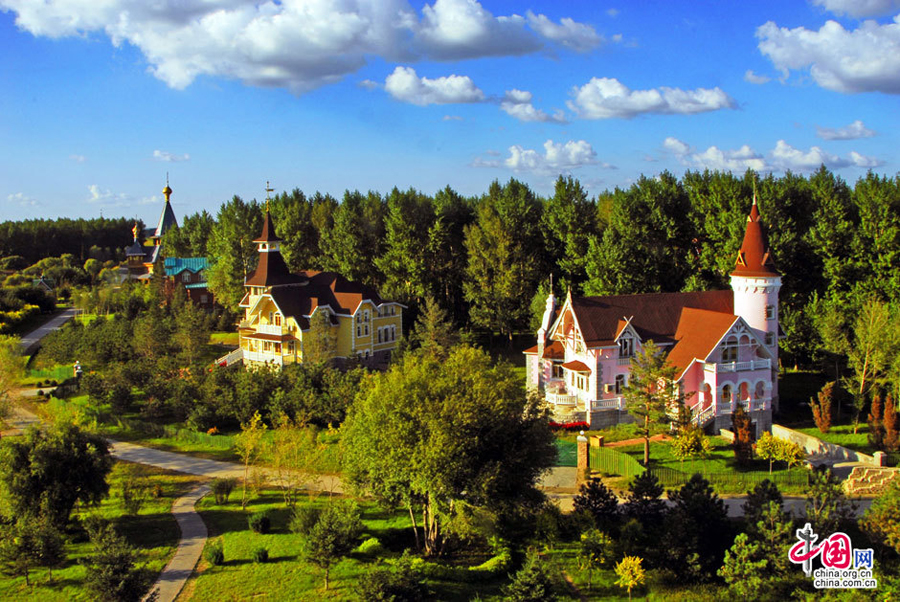 Volga Manor am Ufer des Ashi im Bezirk Xiangfang in Harbin erstreckt sich mit seinen fantastischen Ausblicken, weiten Gärten und Feuchtgebieten auf eine Landfläche von 600.000 Quadratmetern.