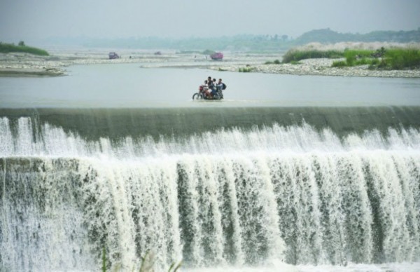 In diesem Sommer wurde in der Stadt Pengzhou eine Brücke zwischen zwei Gemeinden weggerissen. Die Einwohner in den Gemeinden müssen auf dem Damm radfahren oder mit dem Motorrad fahren, um das gegenüberliegende Ufer zu erreichen (Foto vom 11. September). Auf den Bildern sieht es so aus, als ob diese Leute auf einem Wasserfall fahren würden.