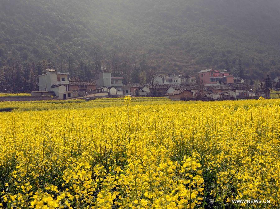 Zwei Mädchen in traditionellen Gewändern der ethnischen Gruppe der Bouyei genießen die Rapsblüten im Kreis Luoping in der südwestchinesischen Provinz Yunnan (Foto vom 20. Februar 2014).