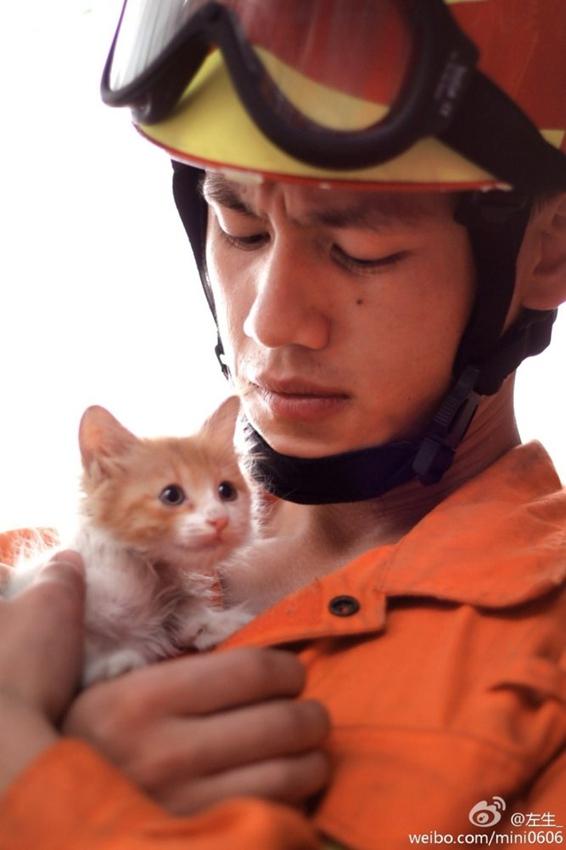 Die Hauptrollen der folgenden Bildserie sind der 20jährige Feuerwehrmann Yie Haojie und eine zwei Monate alte Katze. Am 8. August hat Yie in der ostchinesischen Stadt Hangzhou eine Katze vom Baum gerettet.