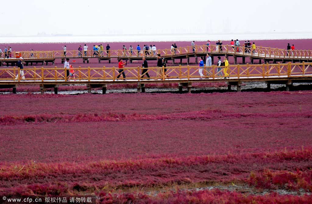 Wie in jedem Herbst zieht derzeit der berühmte rote Strand in Panjin in der nordostchinesischen Provinz Liaoning zahlreiche Touristen an. Dabei handelt es sich um einen Strauch namens Soden.