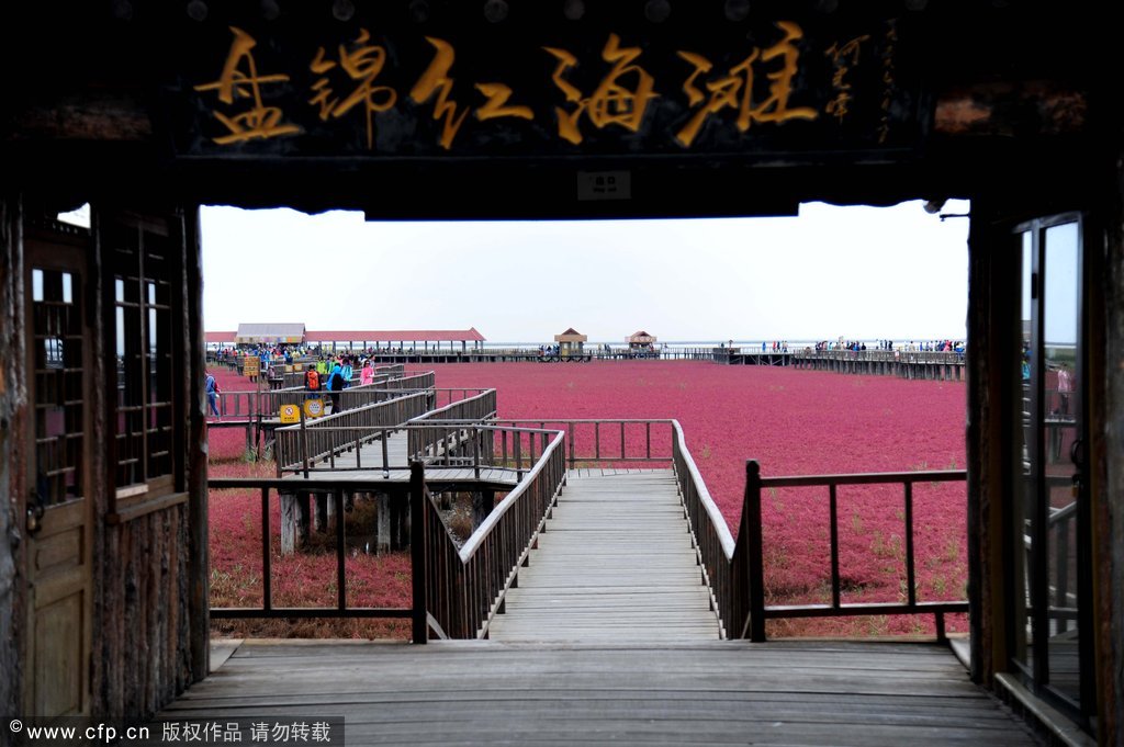 Wie in jedem Herbst zieht derzeit der berühmte rote Strand in Panjin in der nordostchinesischen Provinz Liaoning zahlreiche Touristen an. Dabei handelt es sich um einen Strauch namens Soden.
