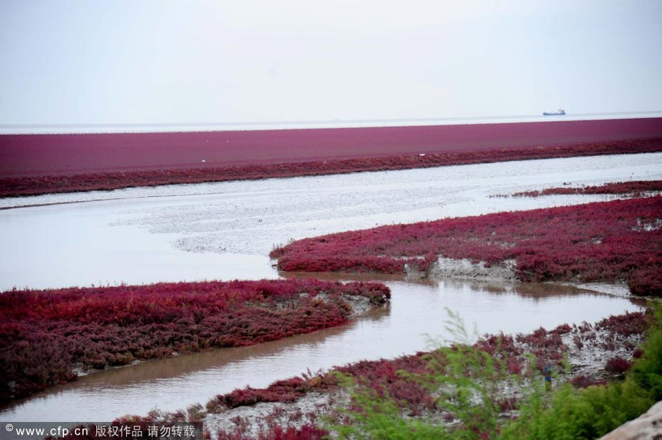 Wie in jedem Herbst zieht derzeit der berühmte rote Strand in Panjin in der nordostchinesischen Provinz Liaoning zahlreiche Touristen an. Dabei handelt es sich um einen Strauch namens Soden.