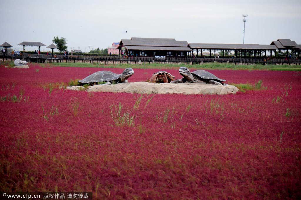 Wie in jedem Herbst zieht derzeit der berühmte rote Strand in Panjin in der nordostchinesischen Provinz Liaoning zahlreiche Touristen an. Dabei handelt es sich um einen Strauch namens Soden.