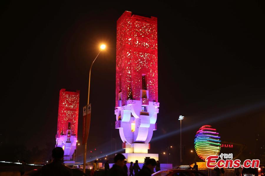 Eine riesige Lichterkugel in Gestalt des offiziellen APEC-Logos auf einer Kreuzung im Beijinger Chaoyang-Distrikt. Die Kugel wurde am Mittwoch, den 29. Oktober 2014 eingeschaltet.