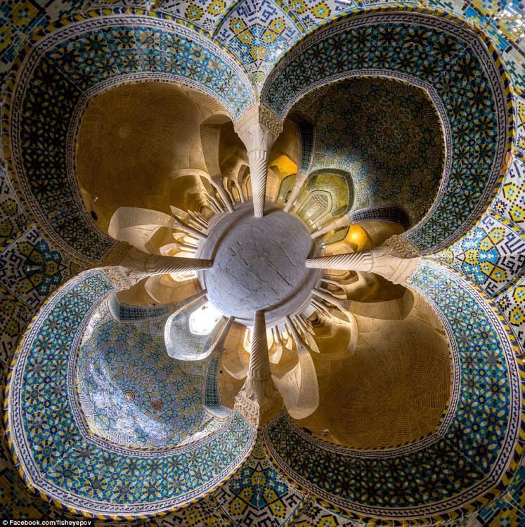 Ein Physik-Studierender aus dem Iran hat kürzlich eine Fotoserie aus dem Inneren einer Moschee gemacht. Die prächtigen Farben und die perfekte Symmetrie der Struktur ergeben einen ungewöhnlichen Kaleidoskop-Effekt.