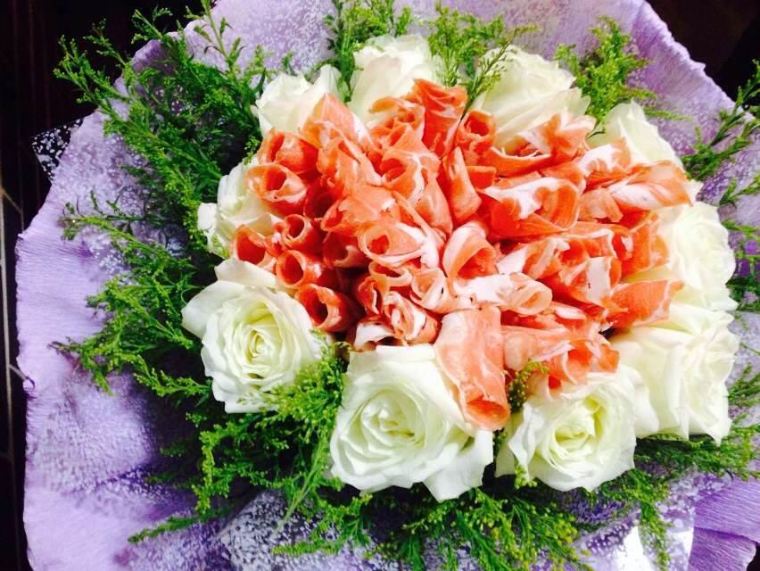 Als seine Freundin sah, dass der „Blumenstrauß“ aus Rindfleisch-Rollen bestand, war sie zuerst ganz erstaunt.