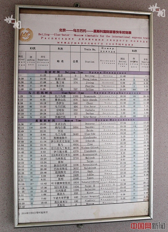 Jeden Mittwoch wartet ein grüner Zug am Hauptbahnhof von Beijing auf seine Passagiere. Auf den dunkelgrünen Waggons prangt eine weiße Plakette, die die Reiseroute anzeigt: „Beijing-Ulaanbaatar-Moskau“. Im Vergleich zu den weißen modernen Hochgeschwindigkeitszügen springt dieser Zug im Stil der 1990er Jahre sofort ins Auge.