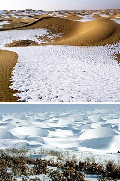 Die Taklamakan Wüste (Xinjiang, China) ist eine der größten Sandwüsten der Welt und befindet sich auf Platz 15 der nicht-polaren Wüsten. Sie erstreckt sich über 337.600 Quadratkilometer im Tarim Becken und ist 1000 Kilometer lang und 400 Kilometer breit. Da Reisende das trockene Wüstenklima umgehen wollten, schufen sie bereits zu frühen Zeiten zwei Äste der Seidenstrasse, von welchen einer südlich und einer nördlich der Wüste vorbeiführt. Im Jahr 2008 bedeckte eine schwere Schneedecke während elf Tagen die Wüste und machte sie zu einem weißen Wunderland.