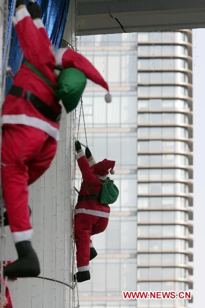 Zwei Weihnachtsmänner klettern in Hangzhou, der Hauptstadt der ostchinesischen Provinz Zhejiang, auf einem Wolkenkratzer (Foto vom 7. Dezember 2010). Die Weihnachtsmänner versetzen Passanten im Vorfeld der Feiertage in Weihnachtsstimmung.