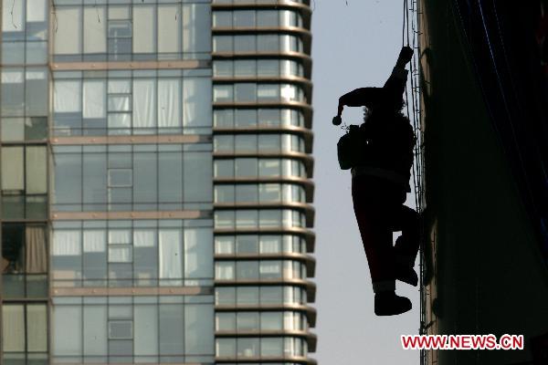Ein Weihnachtsmann klettert in Hangzhou, der Hauptstadt der ostchinesischen Provinz Zhejiang, auf einem Wolkenkratzer (Foto vom 7. Dezember 2010). Die Weihnachtsmänner versetzen Passanten im Vorfeld der Feiertage in Weihnachtsstimmung.