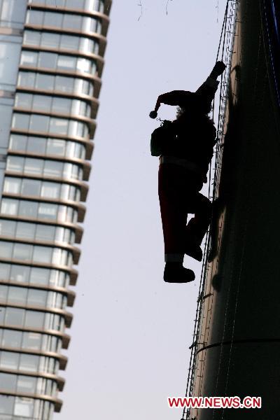 Ein Weihnachtsmann klettert in Hangzhou, der Hauptstadt der ostchinesischen Provinz Zhejiang, auf einem Wolkenkratzer (Foto vom 7. Dezember 2010). Die Weihnachtsmänner versetzen Passanten im Vorfeld der Feiertage in Weihnachtsstimmung.