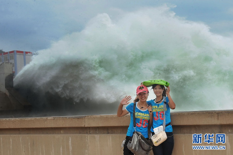 Zwei Touristinnen lassen sich vor dem tobenden Wasser fotografieren.
