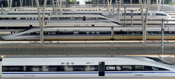 CRH 380 Züge halten am Shanghai Hongqiao Bahnhof im ostchinesischen Shanghai am 23. Juni 2011.