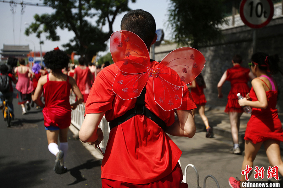 Am Sonntag eilten Hunderte von Läufern in roten Röcken durch Shichahai, einem bekannten Reiseziel im Zentrum der Hauptstadt. Es handelte sich um den "Red Dress Run", der ursprünglich aus Indonesien stammt.