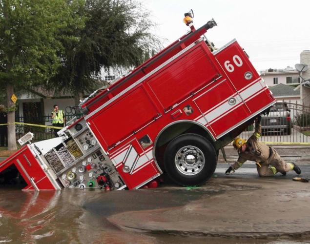 Ein Feuerwehrfahrzeug stürzt in ein Erdloch. Los Angeles, USA, 2009.