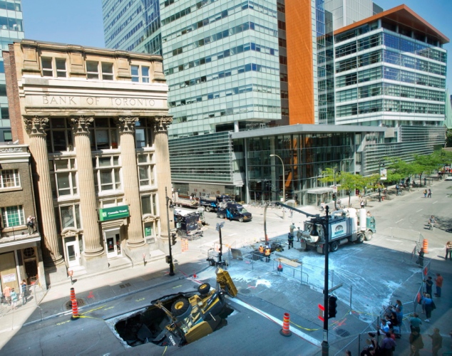 Ein Bagger wird von einem Erdloch verschluckt. Montreal, Kanada, 6. August 2013.