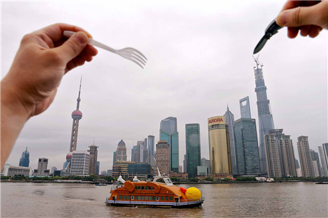 Ein Beobachter macht sich einen Spaß und hält Messer und Gabel über die "Shanghai Ente", die auf dem Fluss Huangpu schwimmt. Im Hintergrund sieht man das Finanzzentrum Lujiazui. Die Fähre ist mit 10.000 Zeitungen bedeckt, die an eine geröstete Pekingente erinnern sollen. Der "geröstete" Körper soll eine Metapher sein für die Gluthitze, unter der Shanghai in diesem Sommer zu leiden hatte. Das dekorierte Schiff ist Teil eines Kunstprojekts auf dem Bund. Doch die Einheimischen waren von der riesigen gelben Ente, die vom holländischen Künstler Florentijn Hofman inspiriert wurde und erst kürzlich in Hongkong zu sehen war, wenig beeindruckt.