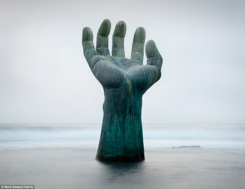 2. Die rechte Hand der Skulptur "Hand of Harmony" im Wasser am Strand von Homigot in Südkorea.