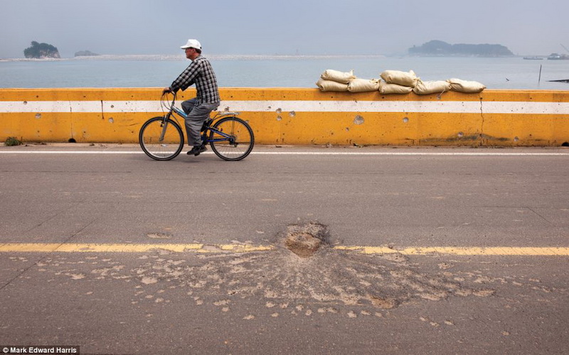 9. Ein Radler fährt an einem Krater vorbei, der durch einen Raketenangriff der nordkoreanischen Seite auf den Süden als Reaktion auf das Manöver Südkoreas auf der Yeonpyeong-Inselgruppe im November 2010 verursacht wurde.