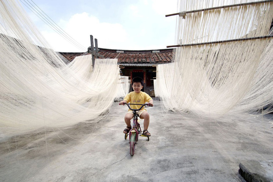 Ein Junge fährt mit dem Rad durch eine Glasnudel-Küche.