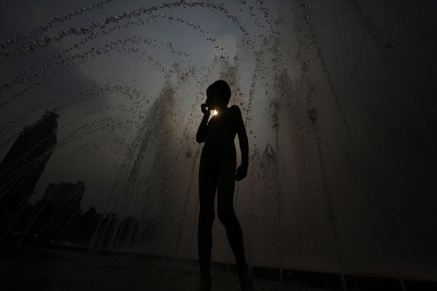Ein Kind spielt bei heißem Wetter mit den Fontänen.