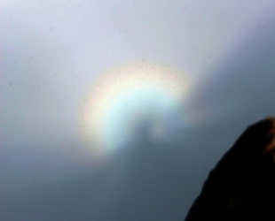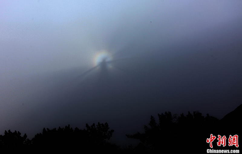 Bei dem "Heiligenschein", den manche Leute wegen seiner menschenähnlichen Gestalt auch als "Buddhas Halo" betrachten, handelt es sich in Wirklichkeit um ein Naturphänomen, dessen Entstehung von diversen klimatischen und geografischen Faktoren abhängig ist. In bergigen Gebieten kann man dieses Naturschauspiel des Öfteren bewundern. (Fotos von Fangye Guangde, chinanews.com.cn )