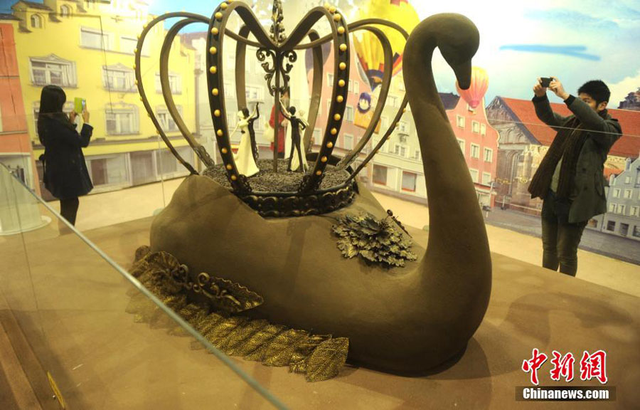 Eine riesige Schwanstatue aus Schokolade.