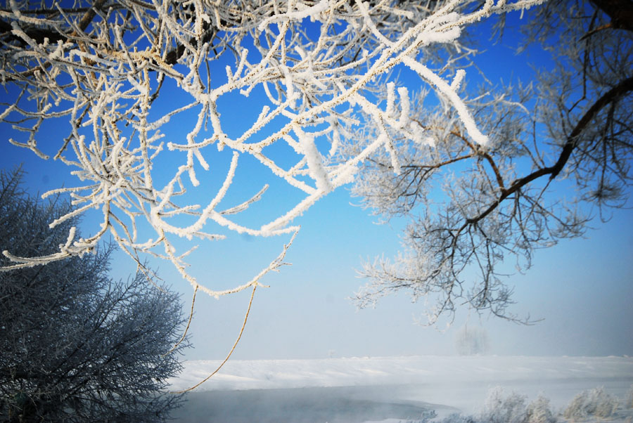 Die Raureif-Landschaft ist ein einzigartiges Wetterphänomen, das entlang dem Songhua-Fluss in der chinesischen Provinz Jilin zu bewundern ist. Durch die niedrigen Temperaturen und durch Nebel kann der Raureif gewöhnlich jeden Winter am Wasser in Jilin beobachtet werden.