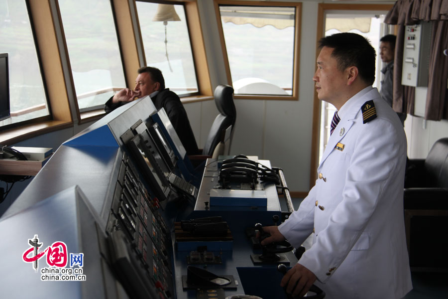 Kapitän Tang Jian hat alles im Griff und steuert das riesige Schiff scheinbar wie Spielzeug.