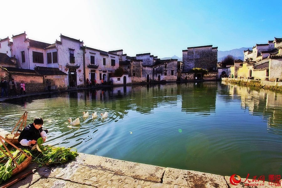 Das Dorf Hongcun befindet sich im Kreis Yixian am Fuße des Südwesthangs des Bergs Huangshan in der Provinz Anhui. Mit Nebel am Morgen, Steinbrücken, Seerosenteichen und Hügeln wird es als malerisches Dorf bezeichnet.