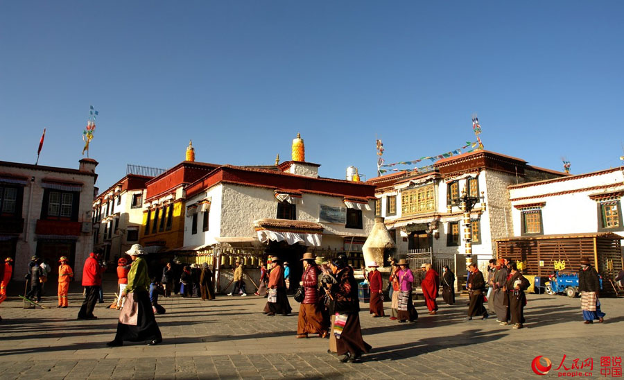 Lhasa ist nicht nur die politische Hauptstadt des Autonomen Gebiets Tibet, sondern auch das geistige Zentrum des tibetischen Buddhismus. Täglich versammeln sich zahlreiche fromme Pilger mit Gebetsmühlen am Potala-Palast und Jokhang.