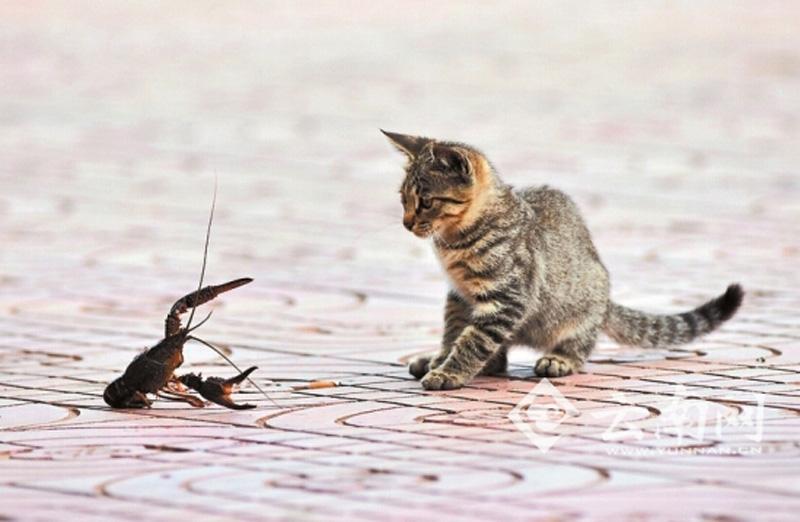 Die Bilder zeigen einen Kampf zwischen einer Languste und drei Katzen am Ufer des Daguan-Flusses in der südwestchinesischen Stadt Kunming.