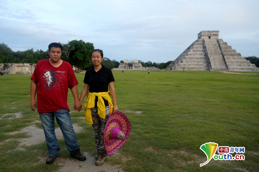 Zhang Xinyu (l.) und Liang Hong posieren für ein Foto vor der Quetzalcoatl-Pyramide – der letzten und größten Pyramide der Maya-Kultur.
