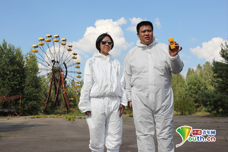 Zhang Xinyu (r.) und Liang Hong sind im August 2012 im Kernkraftwerk Tschernobyl in Russland angekommen und haben den Reaktor 4 besucht. Die radioaktive Strahlung in der Anlage ist immer noch sehr hoch.