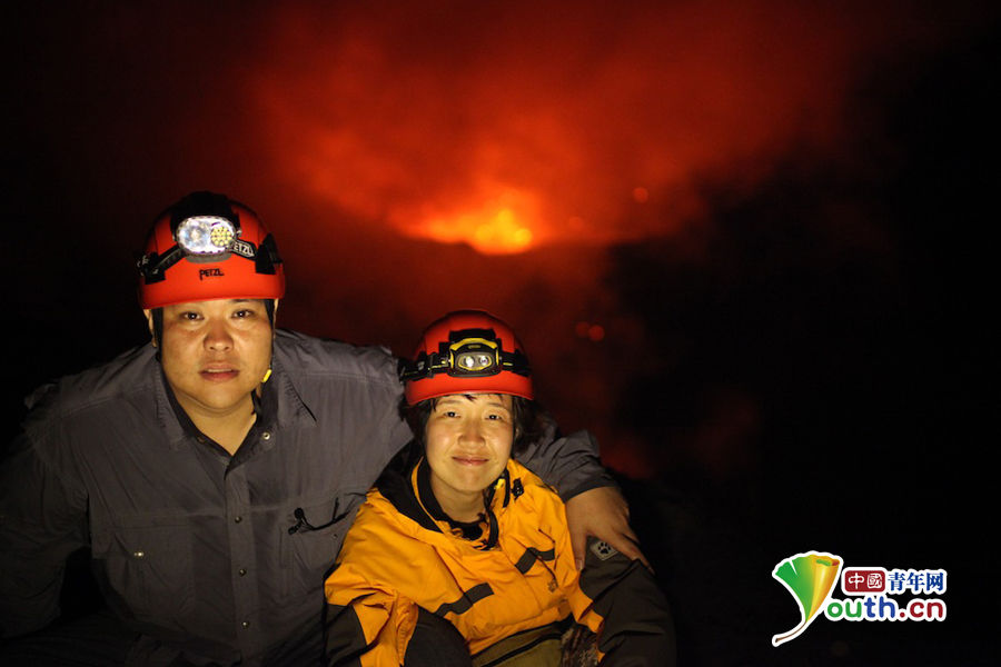 Zhang Xinyu (l.) und Liang Hong posieren am 1. Dezember 2012 für ein Foto 275 Meter tief im Marum Krater, einem aktiven Vulkan, wo die Temperaturen bis zu 1190 Grad Celsius erreichen.