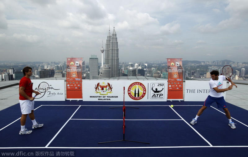 Juan Monaco und David Ferrer spielen Tennis auf dem Dach eines Hochhauses in Kuala Lumpur - eine Werbeaktion für das Malaysian Open. (Foto vom 25. September 2012)