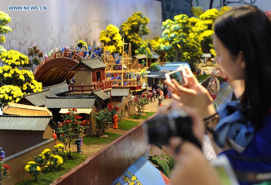 - Besucher sehen sich in einem Themenpavillon der Internationalen Gartenmesse in Qingdao in der ostchinesischen Provinz Shandong eine Miniatur-Landschaftsversion des Gemäldes "Uferszene während des Qingming-Fests" an, die hauptsächlich aus eingetopften Chrysanthemen und Architektur-Modellen besteht (3. Oktober 2014).