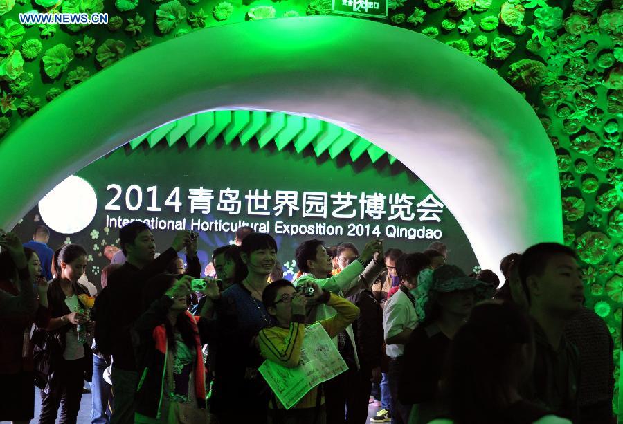 Das Foto vom 3. Oktober 2014 zeigt Besucher im Themenpavillon der Internationalen Gartenmesse in Qingdao.