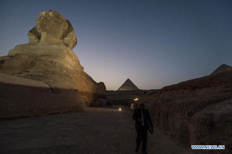 Ein ägyptischer Polizist auf einem Kamel neben der teilweise restaurierten Sphinx im ägyptischen Giza. Ägypten wird den Hof vor der restaurierten Sphinx öffnen, wie ägyptische Beamte am Sonntag ankündigten.