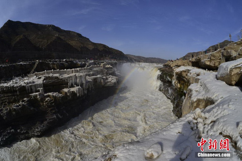 Silberschmelze bildete sich auf beiden Seiten des Hukou Wasserfalls des Huanghe Flusses in der nordchinesischen Provinz Shanxi, als die Temperatur am 11. Dezember 2014 fiel.