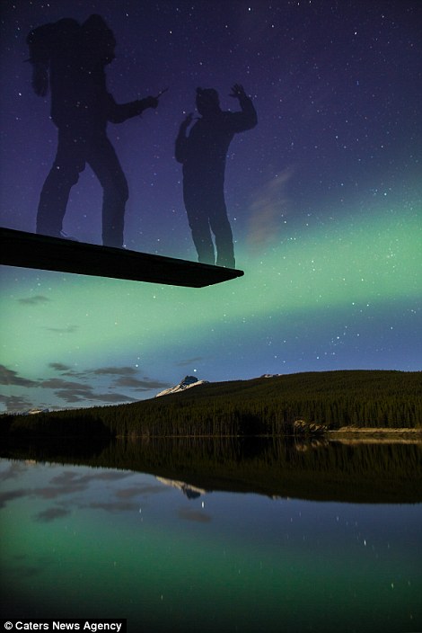 Selfie mit Polarlichtern beim Herbert Lake im Banff National Park in Alberta, Kanada.