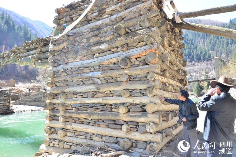 Auf beiden Uferseiten sind diese Baumstämme mit schweren Steinen eingespannt und wirken so als Ausleger.