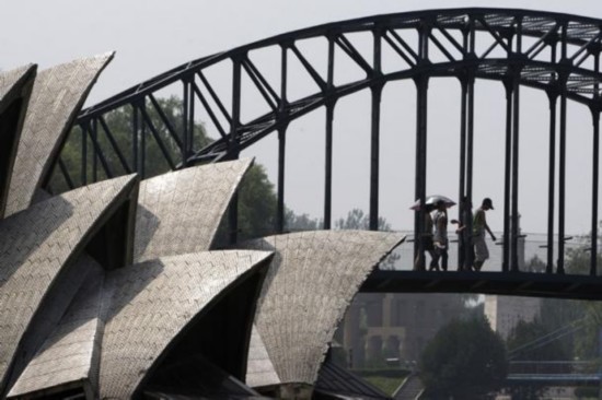Touristen gehen im Beijing World Park durch das Mini-Opernhaus und die Harbor Bridge von Sydney. In dem Themenpark gibt es 109 Reproduktionen berühmter Orte aus aller Welt, einschließlich einer Version des Eiffel-Turms im Größenverhältnis 1:10, den Pyramiden und dem wundervollen Taj Mahal.