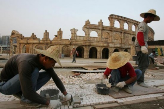 Arbeiter reparieren eine Fußgängerstraße um das Römische Freilicht-Amphitheater (das wie das Kolosseum in Rom aussehen soll) in der Fisherman's Wharf in Macao. Das Legend Boulevard ist der größte und schönste Abschnitt der Fisherman's Wharf, mit einer Sammlung an europäischer und Küstenstadtarchitektur sowie nachgebildeten Straßen und Vororten aus Städten aus aller Welt.