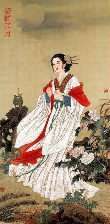 In der Zeit der Drei Reiche (220–280) hatte ein Beamter eine Sängerin namens Diao Chan in seinem Haus. Eines Nachts wanderte sie im Park, da wehte plötzlich ein starker Wind und die Wolken verdeckten das Mondlicht, was der Beamte sah. Um die Schönheit der Haussängerin zu verbreiten, sagte der Beamte überall, dass der Mond gegenüber der Sängerin nur seine Hässlichkeit verstecken musste. Von da an war Diao Chan berühmt, weil sogar "der Mond beim Vergleich mit ihr in den Schatten gestellt wurde".