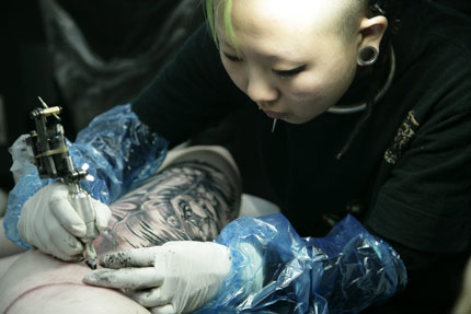 Zhuo Danting ist eine 28-jährige Künstlerin aus der Provinz Heilongjiang im Nordosten Chinas – und am ganzen Körper mit Tattoos überdeckt. Ihre Lippen sind gepierct und sie trägt einen blaugrünen Irokesen-Haarschnitt. Zhou war einst mit einem Iren verheiratet und tätowiert bereits seit neun Jahren andere Menschen. Ihre Kundschaft ist beträchtlich. Rund 60 Prozent von ihnen seien allerdings Expats, erklärt sie. Zhou, die bei Shanghai Tattoo arbeitet, erzählt, dass ihre vorwiegend weibliche Kundschaft aus China sich vor allem mit dem Preis und der Größe des Tattoos auseinandersetzt. "Die Bedeutung eines Bildes und die hygienischen Verhältnisse sind vielen weniger wichtig." Ausländer hingegen hätten oft bereits eine klare Vorstellung davon, was sie wollen, sagt Zhuo.