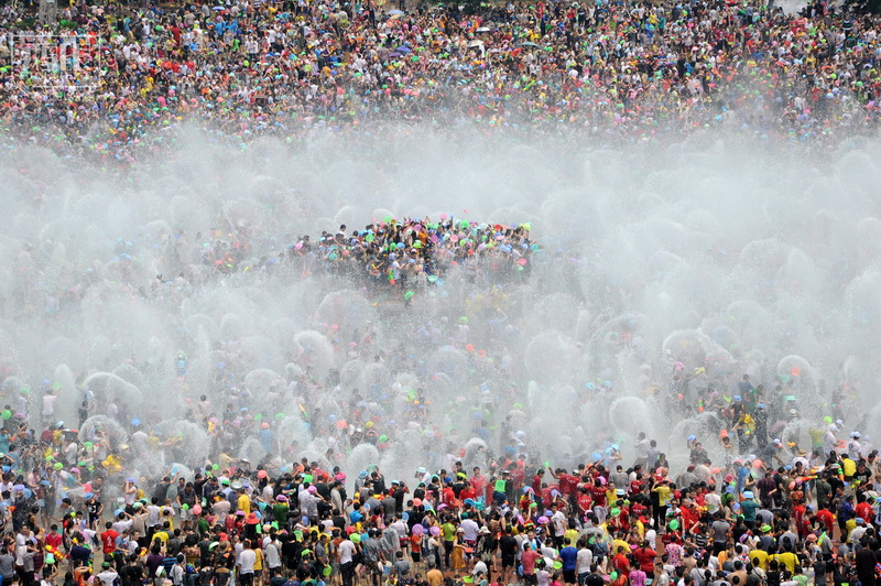 Beim Wasserfest der Nationalität Dai in der Stadt Jinghong, in der Provinz Yunnan, bespritzen sich die Leute gegenseitig mit Wasser. (Foto vom 15. April 2013, Zhang Jin)