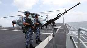 Chinesische Marinesoldaten beobachten am 26. August 2014 vom Deck des amphibischen Landungsschiffs Changbaishan eine Eskortmission im Golf von Aden.